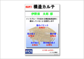 XCADで製図した図面をもとに、一邸一邸厳格な耐震チェックを実施します。耐震·耐風性の重要なポイントとなる5項目のすべてに合格した「イノスの家」には、安心の証明書として「構造カルテ」を発行しています。